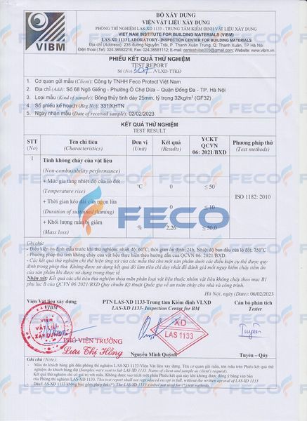 – Bông thủy tinh FECO đáp ứng tất cả các yêu cầu của tiêu chuẩn GB/T 25904-2010 về khả năng chống cháy.